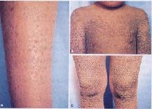 寻常型鱼鳞病:主要表现在四肢伸侧和躯干的燥性褐色菱形,或多角性鳞屑,上臂及大腿伸侧常有明显的毛囊角化性丘疹,掌趾受累。发病率很高,其角化性鳞屑是数层角质细胞不脱落堆积所致,多于出生后数月出现,5岁左右最重,青春期后症状可能减轻但随着年龄的增大和治疗不当病情加重。